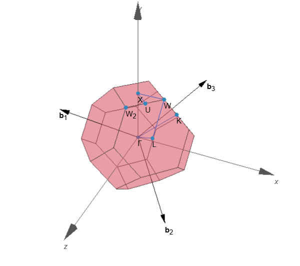 point located at the center of a cell, reaches the cell boundary through the hexagonal face. Then, the path iterates over the high symmetry points at the edges of the cell. The path ends at point X, the center of the square face.