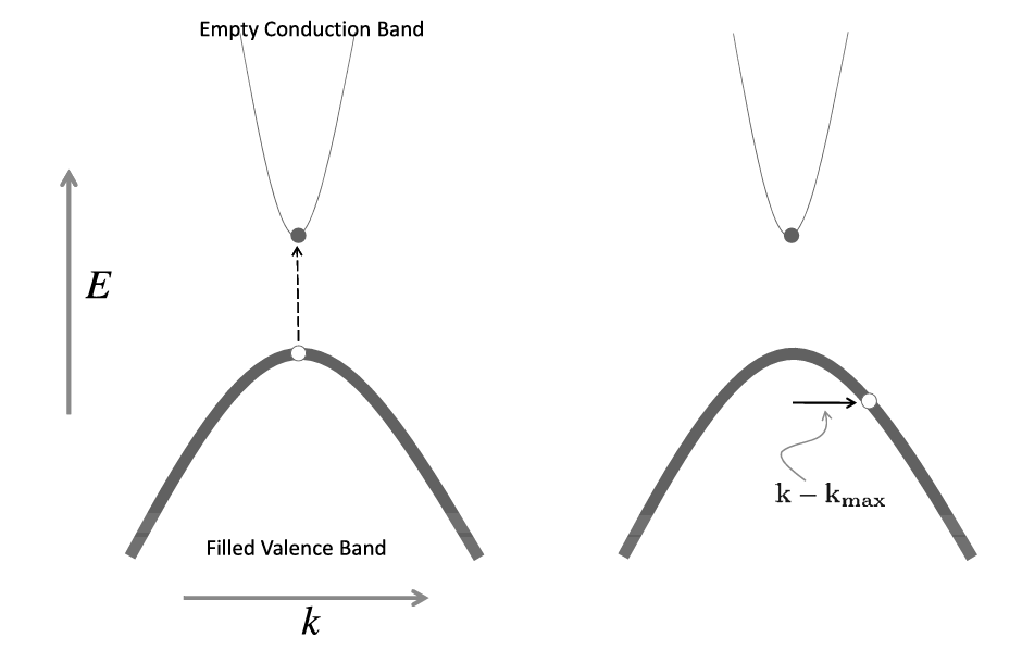 Figure. Holes and electrons on a simplified parabolic band. (Oxford Solid State Basics)
