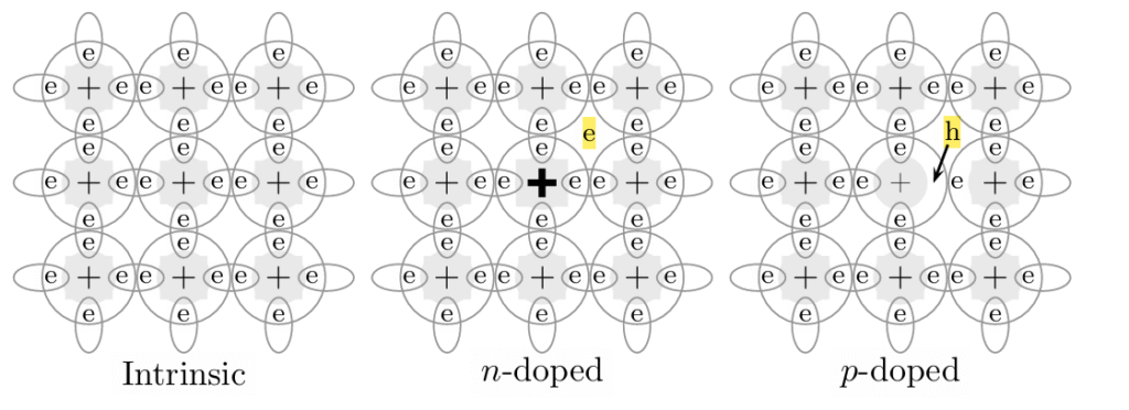 Figure. Demonstrative diagram of n-doped and p-doped semiconductor. The donor impurity of the n-doped semiconductor adds a free electron to the solid as the acceptor impurity incurs a vacancy in a p-doped semiconductor.